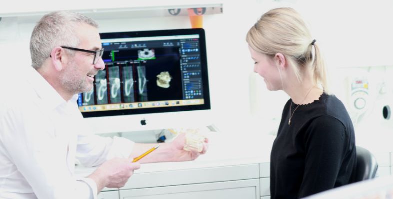 So werden zum Beispiel auf Wunsch des Patienten die 3D-Röntgenaufnahmen (digitale Volumentomografie) für die Implantatplanung bei uns in der Praxis durchgeführt.